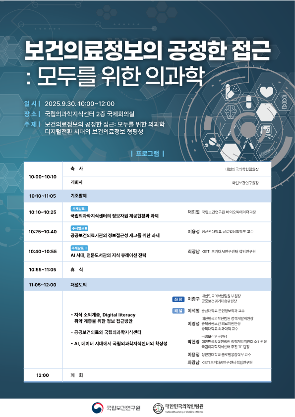 2025년 09월 30일에 제 25회 보건의료포럼 "보건의료정보의 공정한 접근: 모두를 위한 의과학" 을 아래와 같이 개최하고자 합니다.