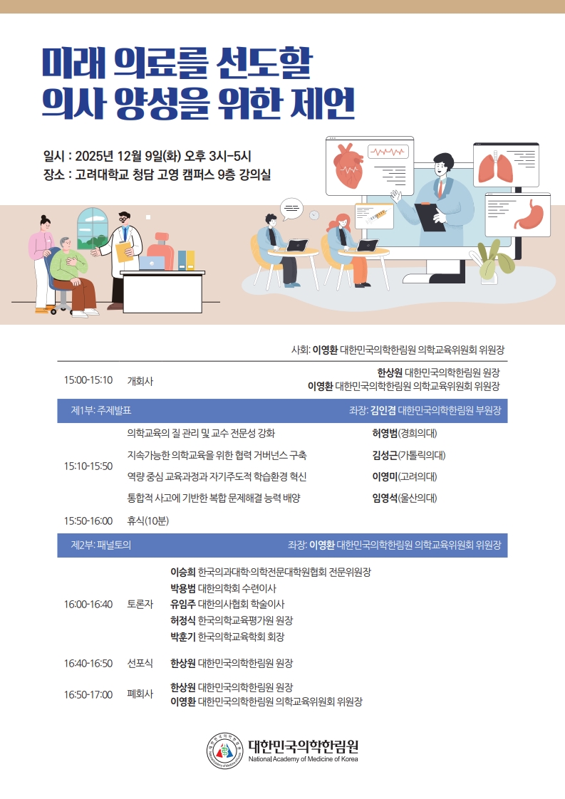2025년 12월 9일(화)에 의학교육위원회 심포지엄 「미래 의료를 선도할 의사 양성을 위한 제언」 을 아래와 같이 개최할 예정입니다.